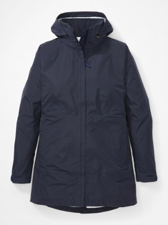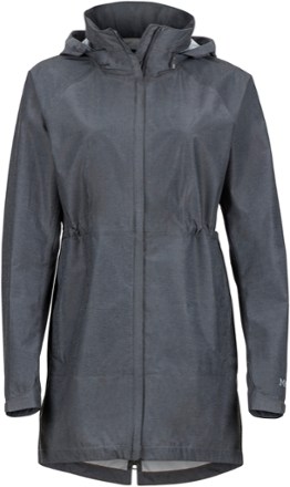 The marmot women s celeste jacket is a long rain jacket for weather protection in the city.
